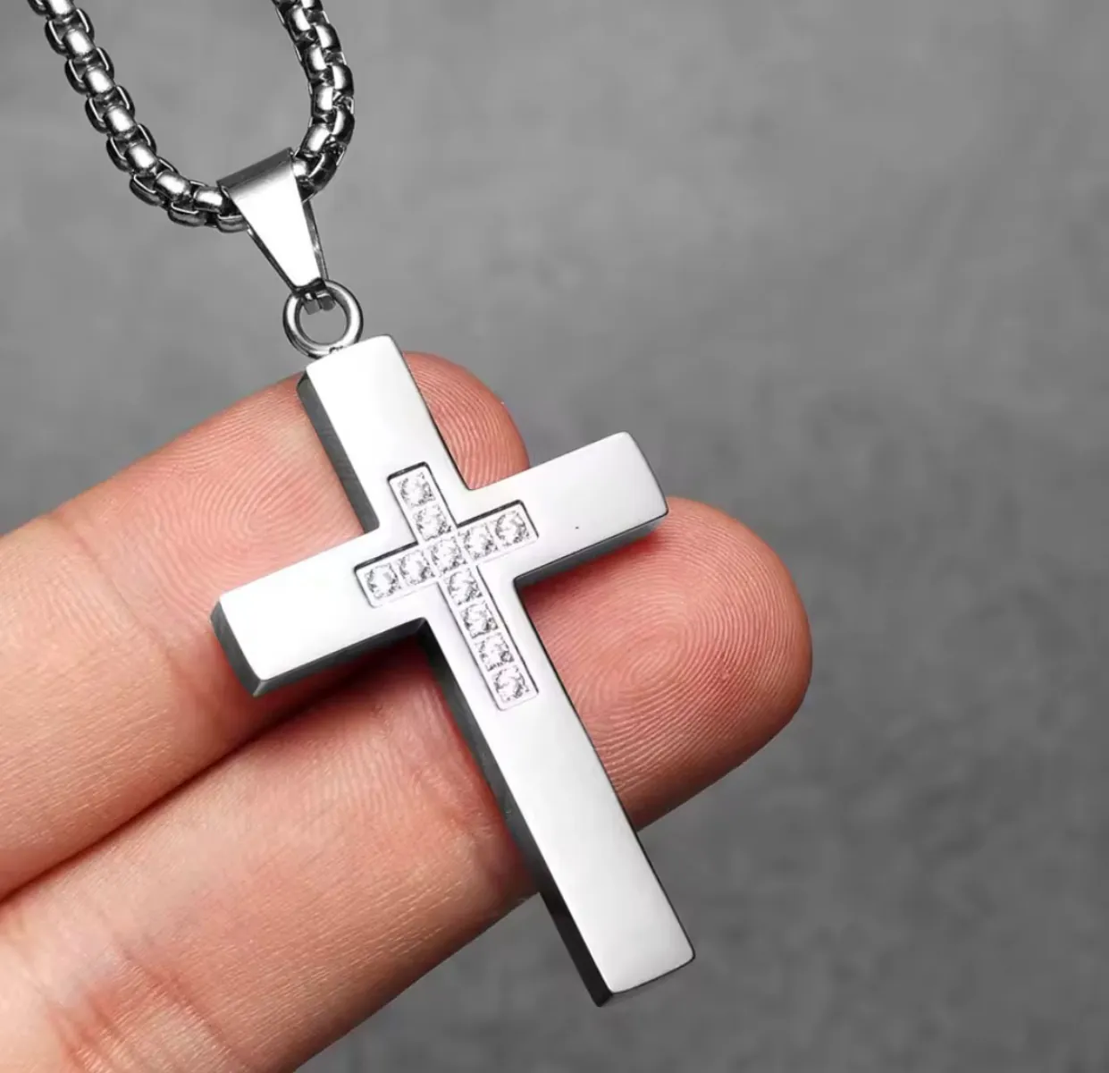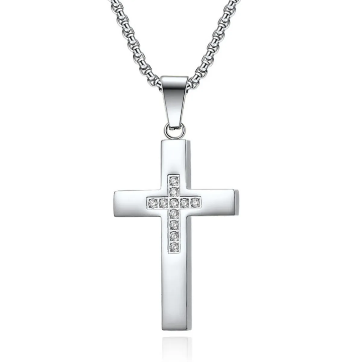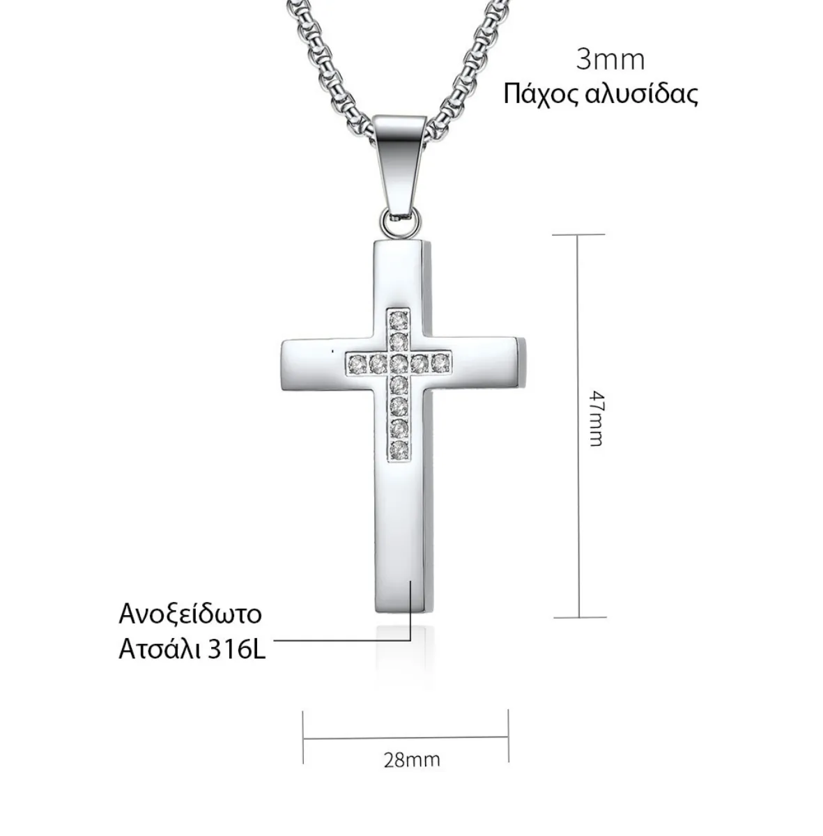 Ανδρικός σταυρός από ανοξείδωτο ατσάλι με λευκές πέτρες zircon σε ασημί χρώμα και γυαλιστερό φινίρισμα. bode 02971