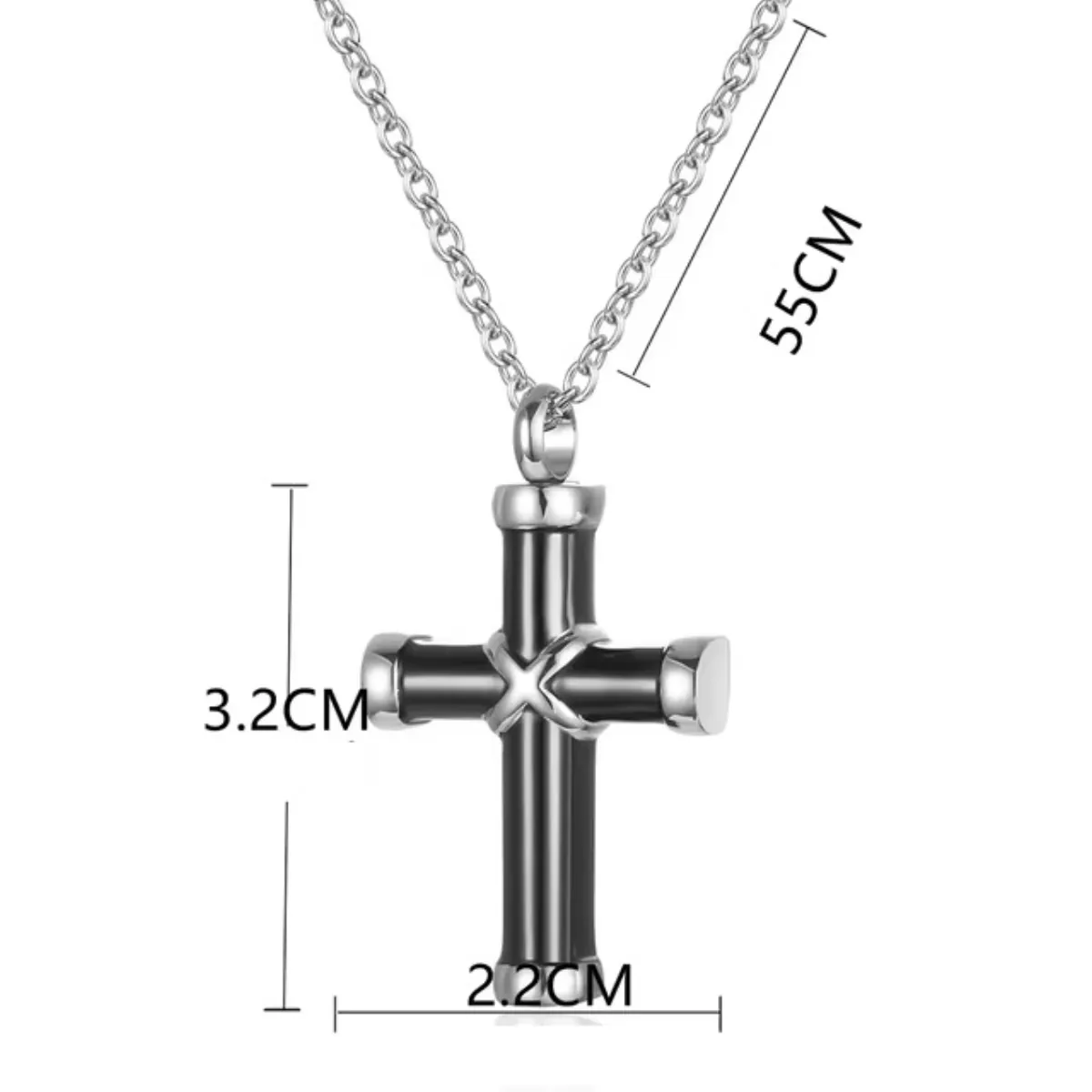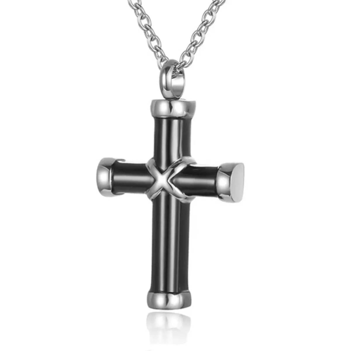Ανδρικός σταυρός ατσάλι 316L σε ασημί/μαύρο χρώμα με αλυσίδα. Υπάρχει η δυνατότητα να ανοίξει από τη μια μεριά και διαθέτει και βοηθητικό εξάρτημα. Μάκρος αλυσίδας 50cm. BODE 03970