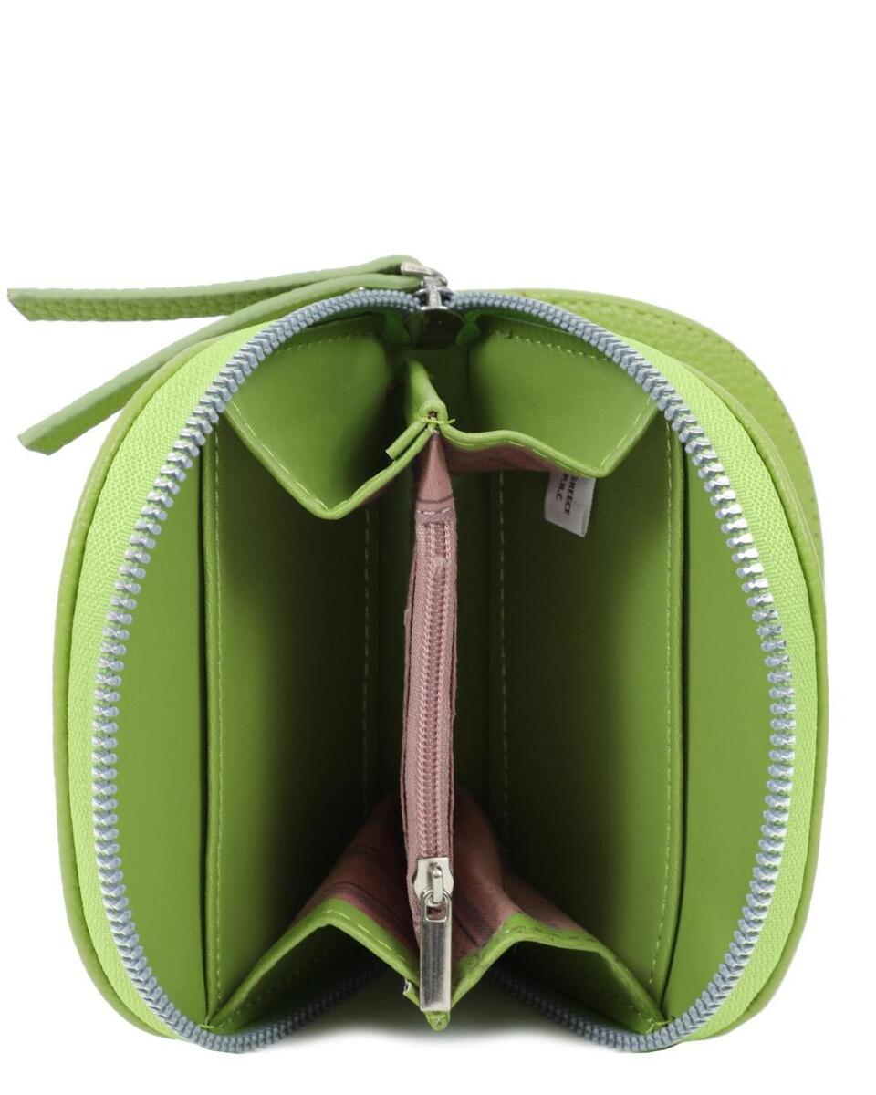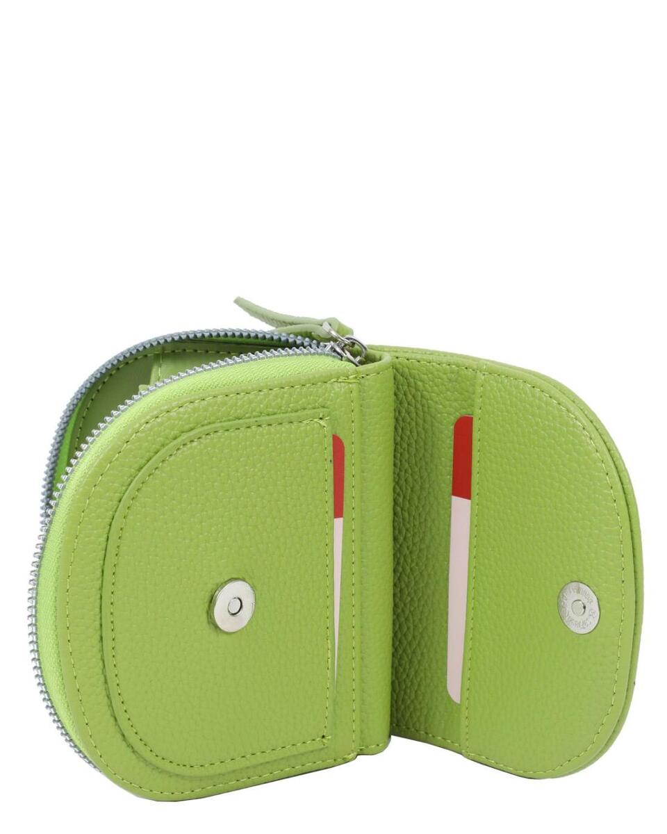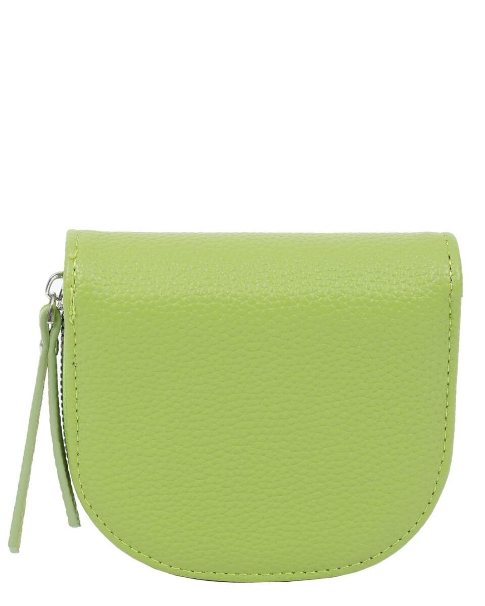 Πορτοφόλι σε πράσινο χρώμα με διακοσμητικές λεπτομέρειες και κλείσιμο με καπάκι. Κατασκευασμένο από συνθετικό δέρμα.